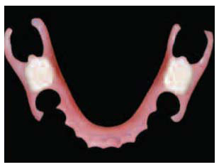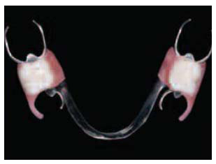 Fig.2 – For increased strength Valplast can be used in conjunction with a cast metal frame such which decreses the flexibility of the prosthesis. The Valplast clasps still provide excellent esthetics.