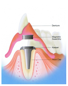The magnetic assembly contains the magnet inside and is set in denture base. The keeper is magnetically attracted to the magnetic assembly and is attached to the tooth root. Additional retention of the prosthesis is thus provided by the attraction between the magnet in the denture and the keeper on the root face. (Fig1-1a)