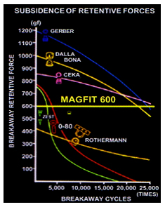 Fig 1-1b The retentive force after repeat engagement and disengagement of various retainers. Only magnetic attachment maintains their retentive force.